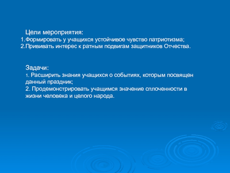 1. Расширить знания учащихся о событиях, которым посвящен данный праздник;