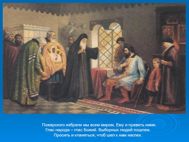 Слайд 16 Пожарского избрали мы всем миром, Ему и править нами.
