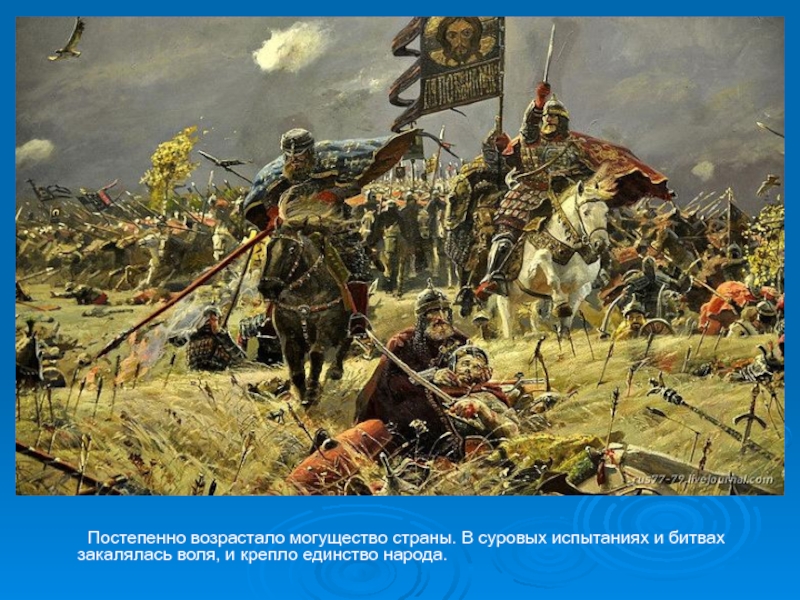 Слайд 9 Постепенно возрастало могущество страны. В суровых испытаниях и битвах закалялась воля,