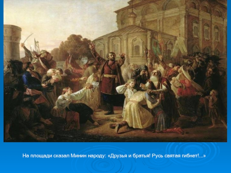 На площади сказал Минин народу: «Друзья и братья! Русь святая
