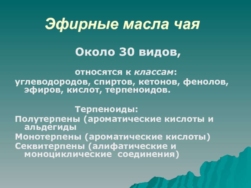 углеводородов, спиртов, кетонов, фенолов, эфиров, кислот, терпеноидов.