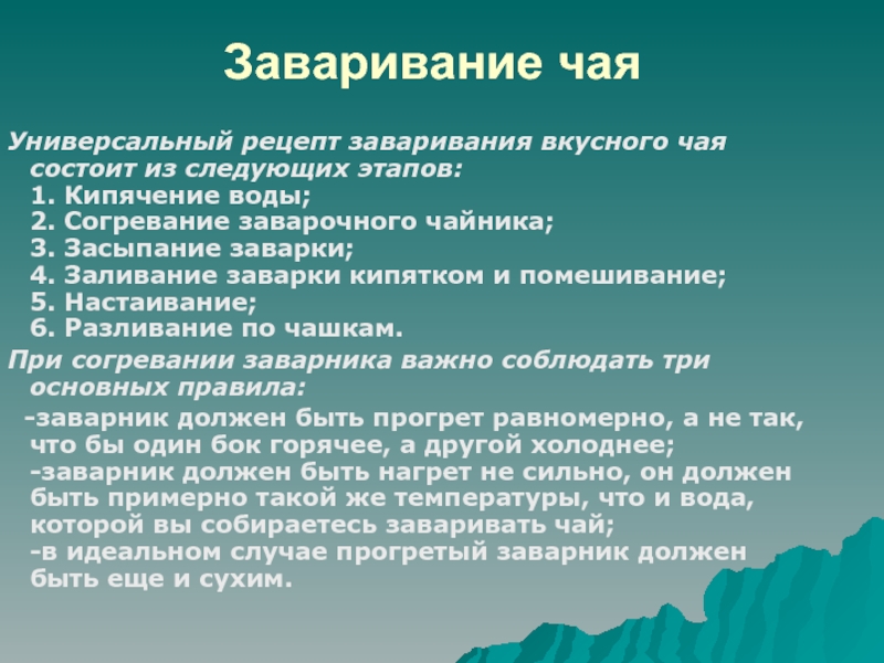 Универсальный рецепт заваривания вкусного чая состоит из следующих этапов: