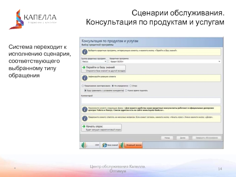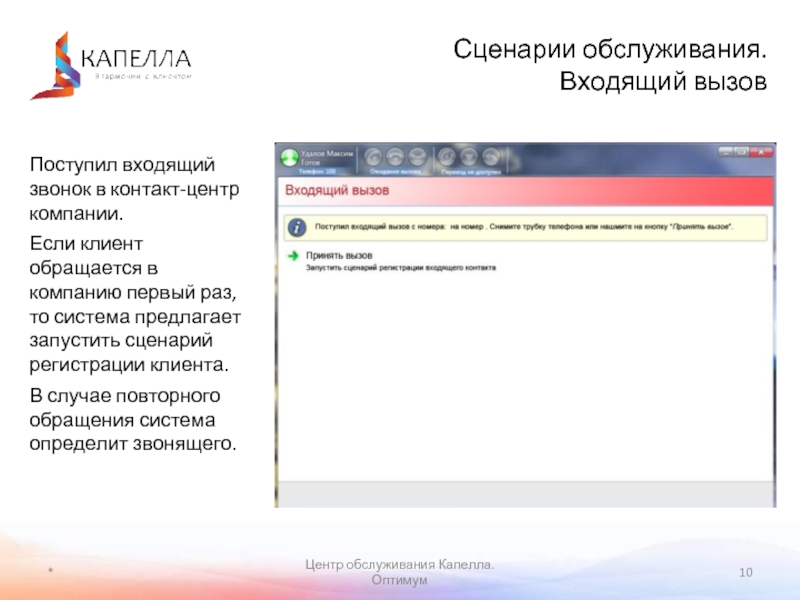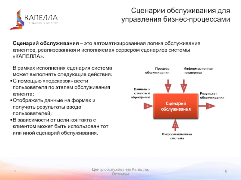 Сценарий обслуживания – это автоматизированная логика обслуживания клиентов, реализованная и исполняемая сервером сценариев системы «КАПЕЛЛА».