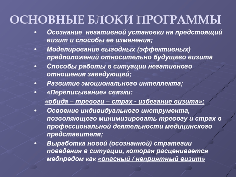 Выработка новой (осознанной) стратегии поведения в ситуации, которая расценивается медпредом как «опасный / неприятный визит»
