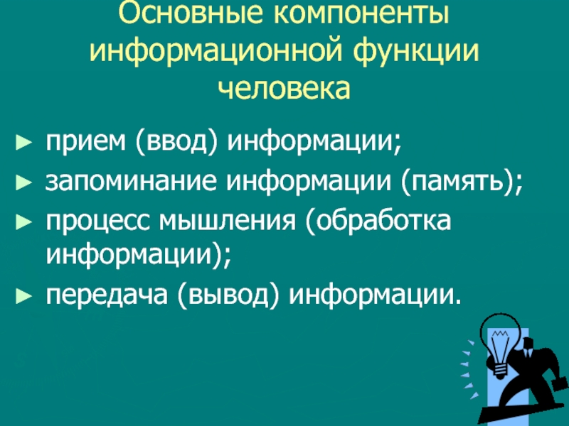 Слайд 5Компьютер включает в себя устройства, выполняющие эти функции мыслящего человека: