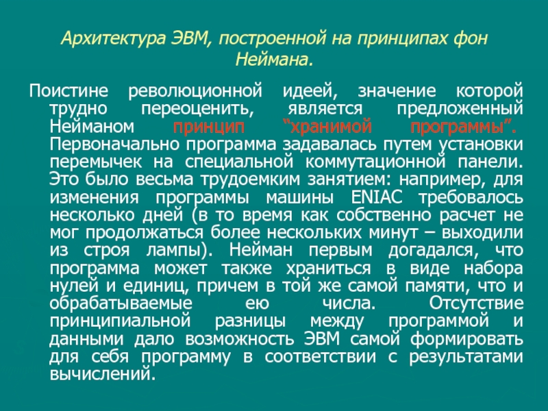 ученым Джоном фон Нейманом. Дж. фон Нейман сформулировал основные принципы работы ЭВМ, которые во многом сохранились и в современных компьютерах.