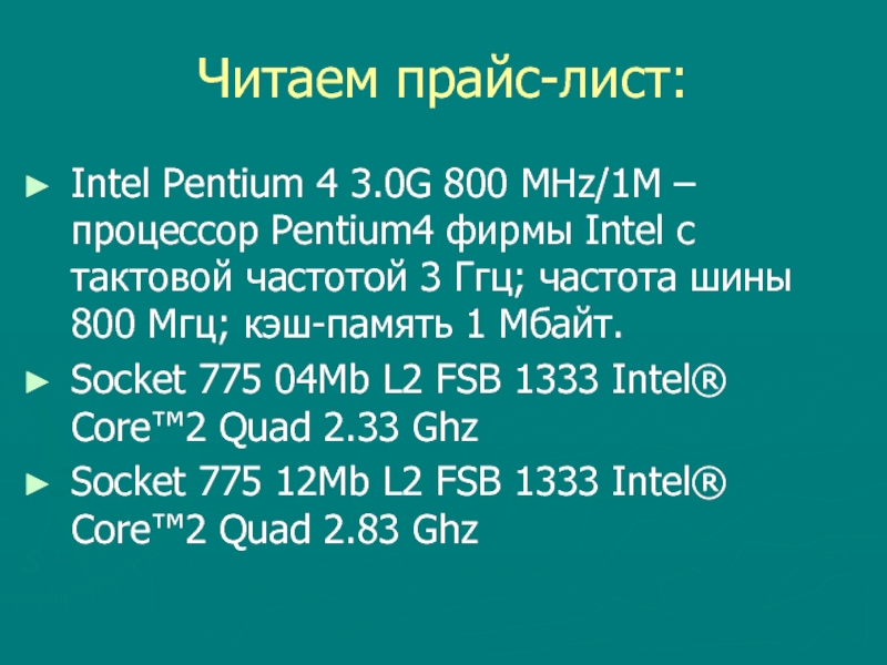 Intel с тактовой частотой 3 Ггц; частота шины 800 Мгц; кэш-память 1 Мбайт.