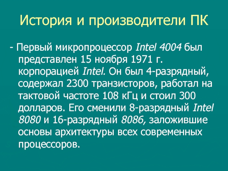 ноября 1971 г. корпорацией Intel. Он был 4-разрядный, содержал 2300 транзисторов, работал на тактовой частоте 108 кГц и стоил 300 долларов. Его сменили 8-разрядный Intel 8080 и 16-разрядный 8086, заложившие основы архитектуры всех современных процессоров.