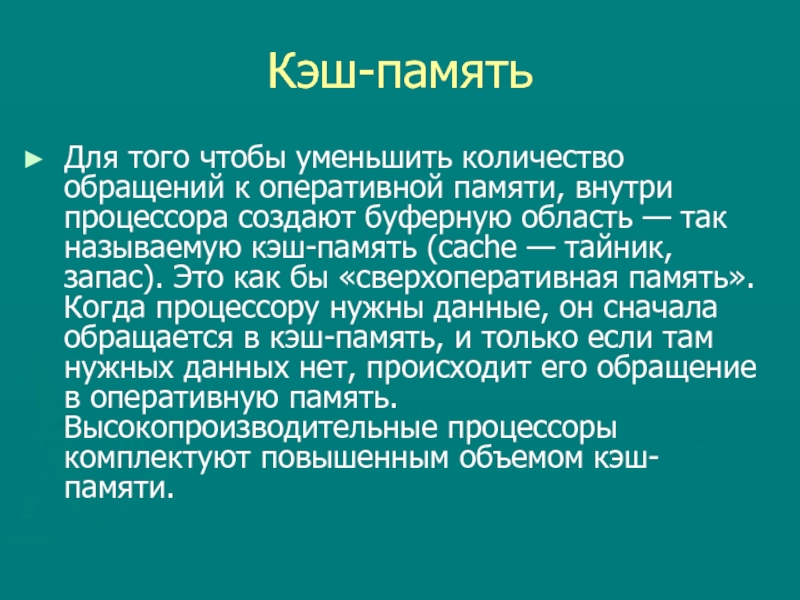 создают буферную область — так называемую кэш-память (cache — тайник, запас). Это как бы «сверхоперативная память». Когда процессору нужны данные, он сначала обращается в кэш-память, и только если там нужных данных нет, происходит его обращение в оперативную память. Высокопроизводительные процессоры комплектуют повышенным объемом кэш-памяти.