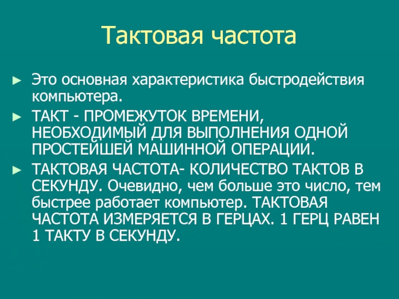 ТАКТОВАЯ ЧАСТОТА- КОЛИЧЕСТВО ТАКТОВ В СЕКУНДУ. Очевидно, чем больше это число, тем быстрее работает компьютер. ТАКТОВАЯ ЧАСТОТА ИЗМЕРЯЕТСЯ В ГЕРЦАХ. 1 ГЕРЦ РАВЕН 1 ТАКТУ В СЕКУНДУ.