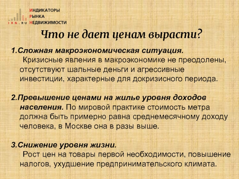 2.Превышение ценами на жилье уровня доходов населения. По мировой практике стоимость метра должна быть примерно равна среднемесячному доходу человека, в Москве она в разы выше.