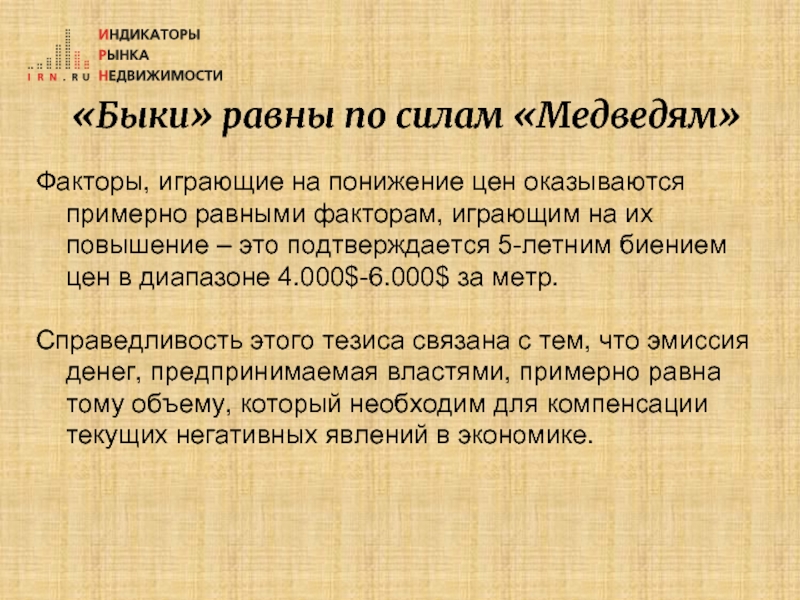 2.Колебания цен с размахом плюс-минус 10%-15%-20% вокруг отметки 5.000$ за метр по индексу IRN.RU, т.е. в диапазоне 4.000$-6.000$ за метр.