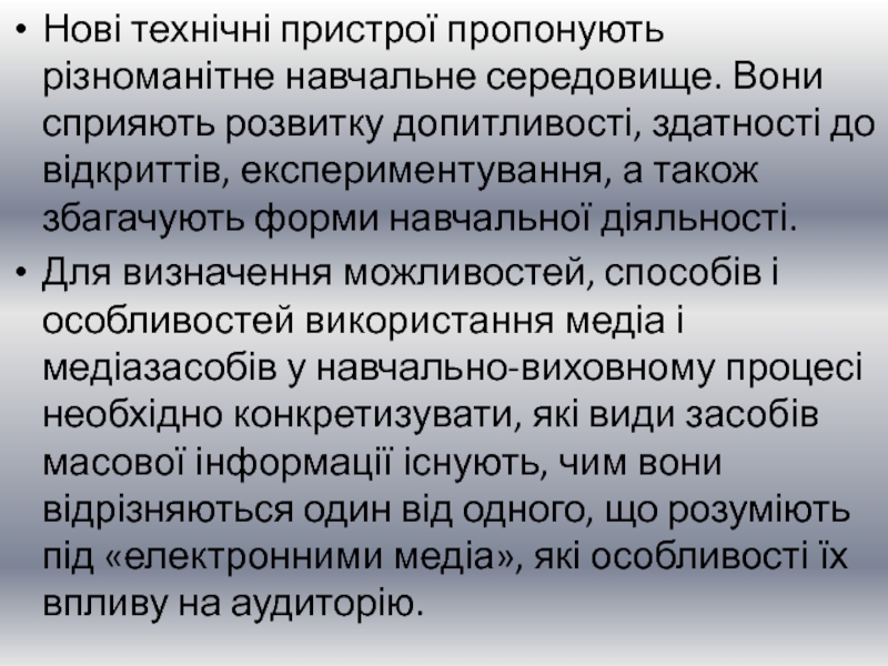 Нові технічні пристрої пропонують різноманітне навчальне середовище. Вони сприяють розвитку допитливості,