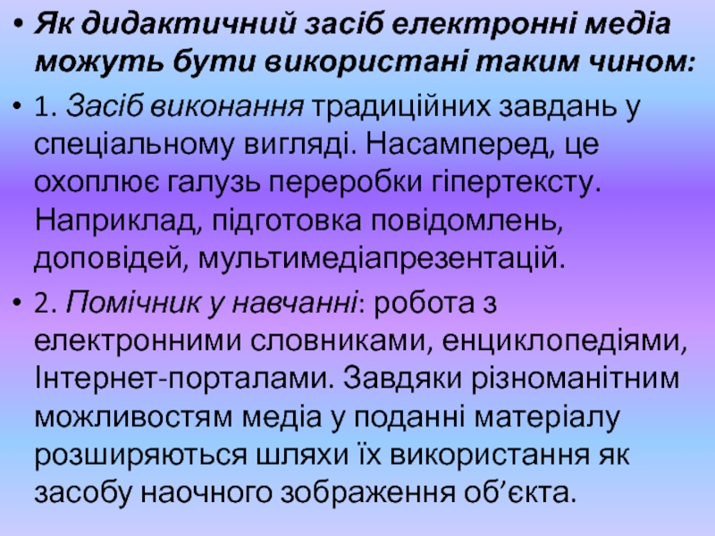 Як дидактичний засіб електронні медіа можуть бути використані таким чином:
