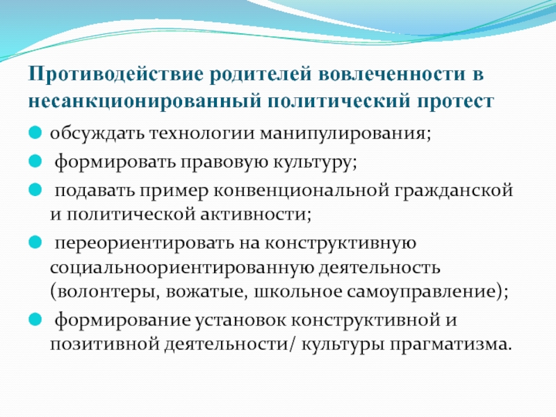 Слайд 28Противодействие родителей вовлеченности в несанкционированный политический протест