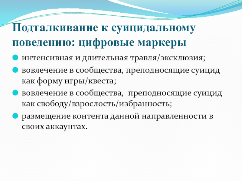Слайд 17Подталкивание к суицидальному поведению: цифровые маркеры