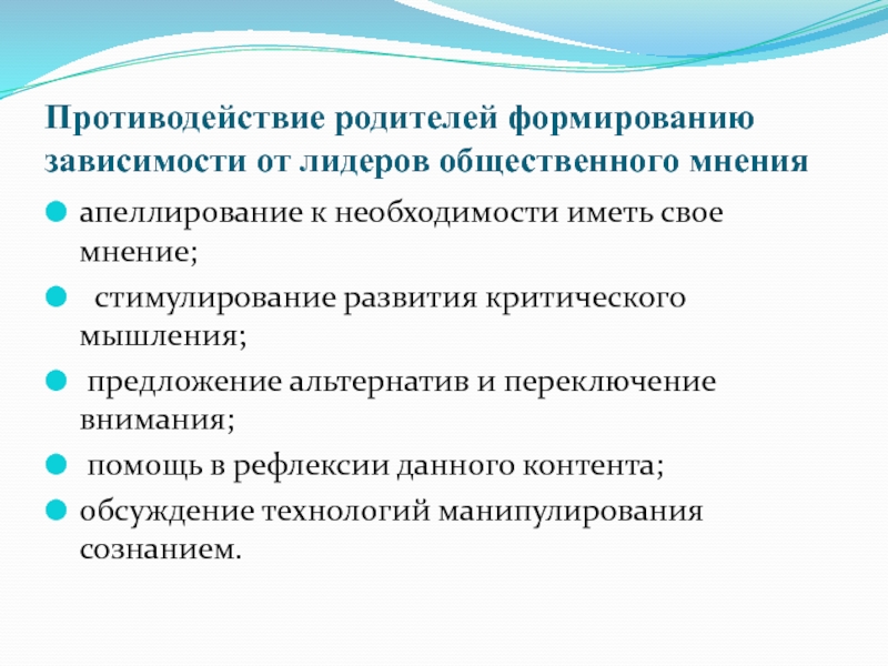 Слайд 25Противодействие родителей формированию зависимости от лидеров общественного мнения