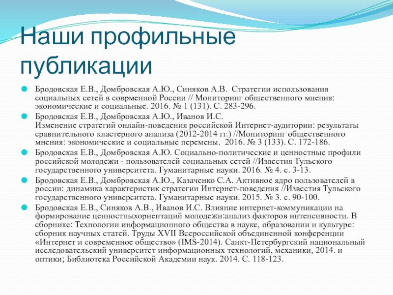 Бродовская Е.В., Домбровская А.Ю. Социально-политические и ценностные профили российской молодежи - пользователей социальных сетей //Известия Тульского государственного университета. Гуманитарные науки. 2016. № 4. с. 3-13.