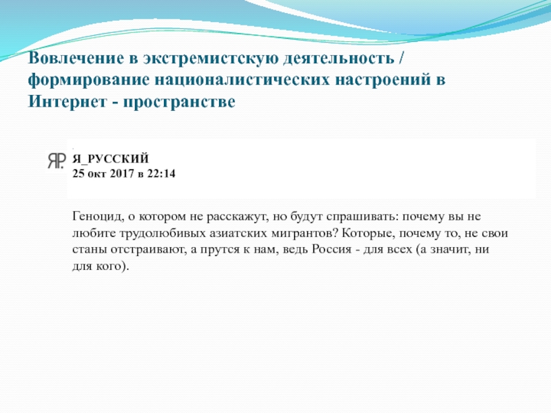 Слайд 21Вовлечение в экстремистскую деятельность / формирование националистических настроений в Интернет -