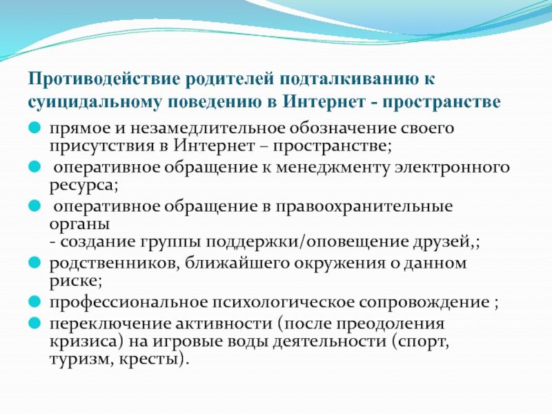 Слайд 19Противодействие родителей подталкиванию к суицидальному поведению в Интернет - пространстве