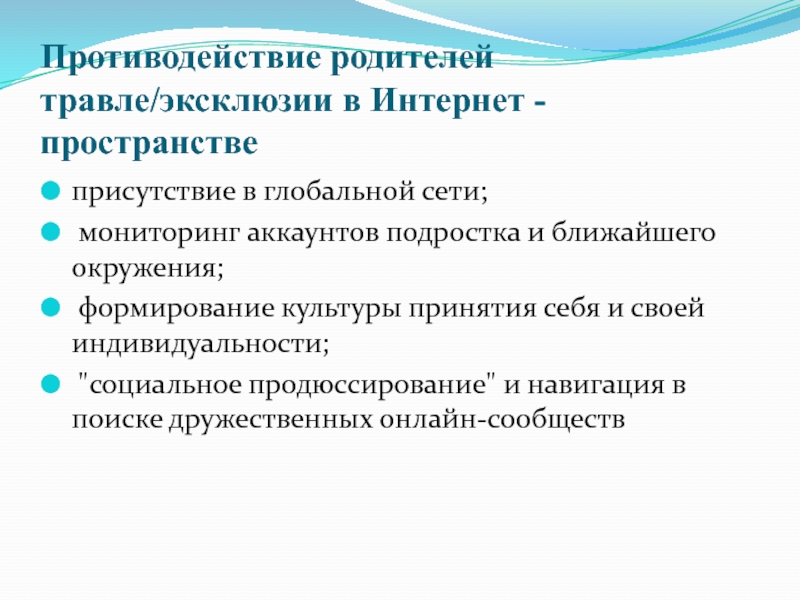 Слайд 16Противодействие родителей травле/эксклюзии в Интернет - пространстве