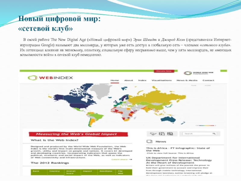 Digital Age («Новый цифровой мир») Эрик Шмидт и Джаред Коэн (представители Интернет-корпорации Google) называют два миллиарда, у которых уже есть доступ в глобальную сеть – членами «сетевого клуба». Их потенциал влияния на экономику, политику, социальную сферу несравнимо выше, чем у пяти миллиардов, не имеющих возможности войти в сетевой клуб немедленно.