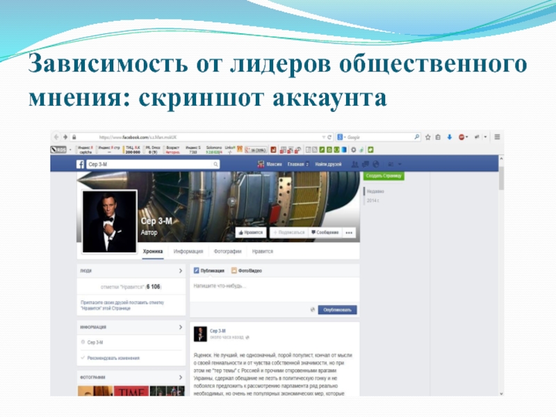Слайд 24Зависимость от лидеров общественного мнения: скриншот аккаунта