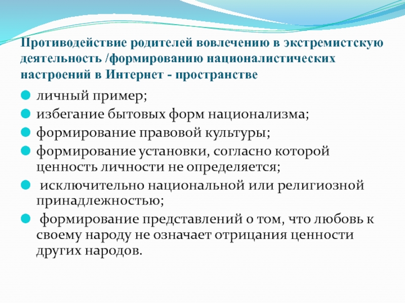 Слайд 22Противодействие родителей вовлечению в экстремистскую деятельность /формированию националистических настроений в Интернет