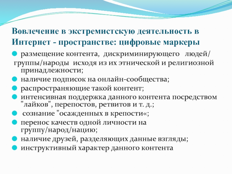 Слайд 20Вовлечение в экстремистскую деятельность в Интернет - пространстве: цифровые маркеры
