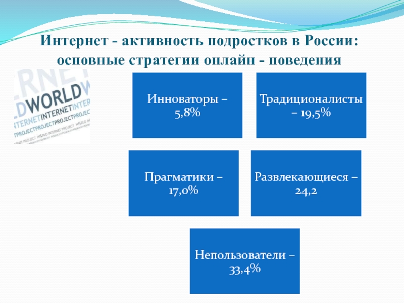 Слайд 7Интернет - активность подростков в России: основные стратегии онлайн - поведения