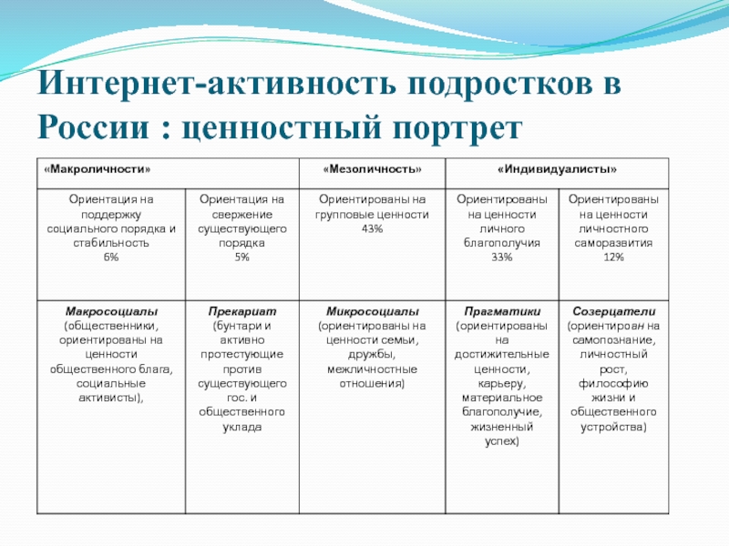 Слайд 10Интернет-активность подростков в России : ценностный портрет
