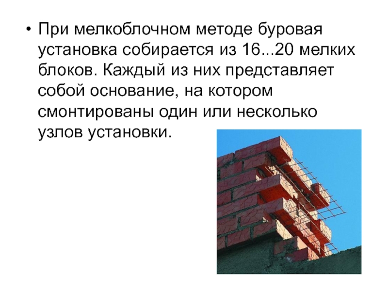 Слайд 6При мелкоблочном методе буровая установка собирается из 16...20 мелких блоков. Каждый