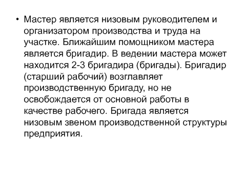Слайд 25Мастер является низовым руководителем и организатором производства и труда на участке.