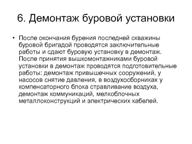 заключительные работы и сдают буровую установку в демонтаж. После принятия вышкомонтажниками буровой установки в демонтаж проводятся подготовительные работы: демонтаж привышечных сооружений, у насосов снятие давления, в воздухосборниках у компенсаторного блока стравливание воздуха, демонтаж коммуникаций, мелкоблочных металлоконструкций и электрических кабелей.