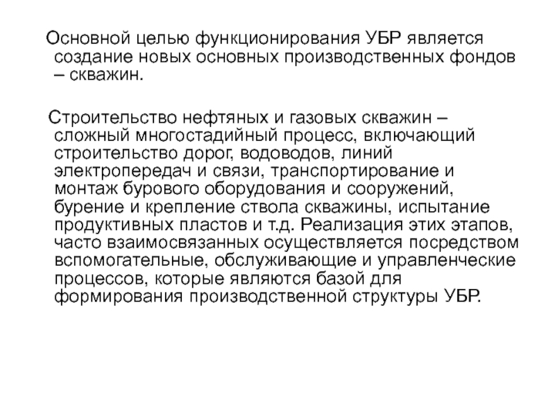 Строительство нефтяных и газовых скважин – сложный многостадийный процесс, включающий строительство дорог, водоводов, линий электропередач и связи, транспортирование и монтаж бурового оборудования и сооружений, бурение и крепление ствола скважины, испытание продуктивных пластов и т.д. Реализация этих этапов, часто взаимосвязанных осуществляется посредством вспомогательные, обслуживающие и управленческие процессов, которые являются базой для формирования производственной структуры УБР.