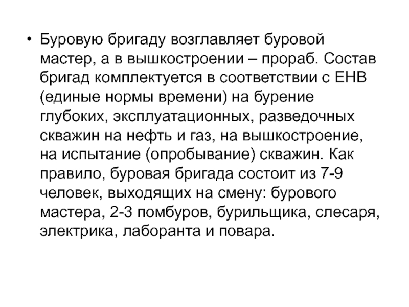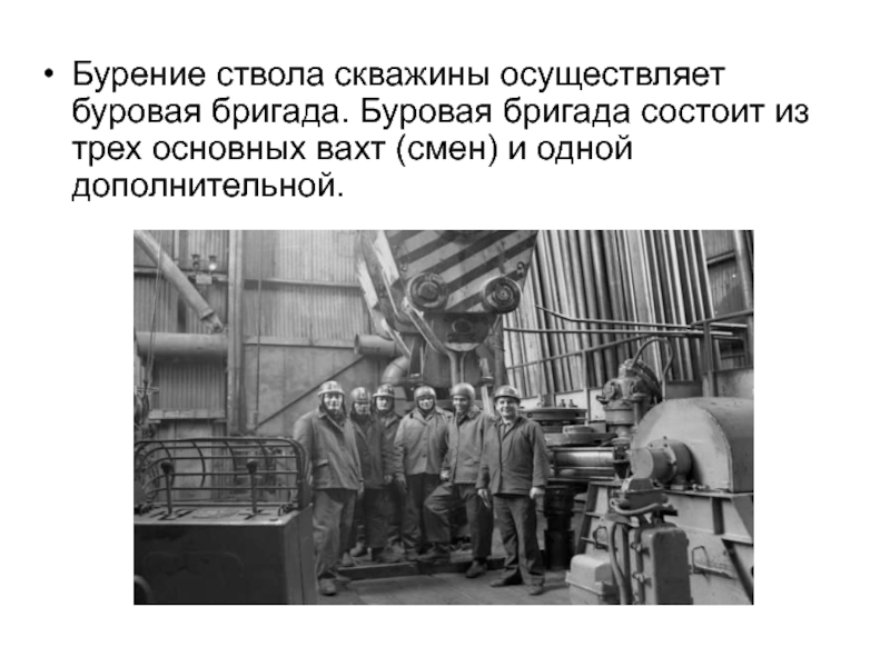 Слайд 26Бурение ствола скважины осуществляет буровая бригада. Буровая бригада состоит из трех