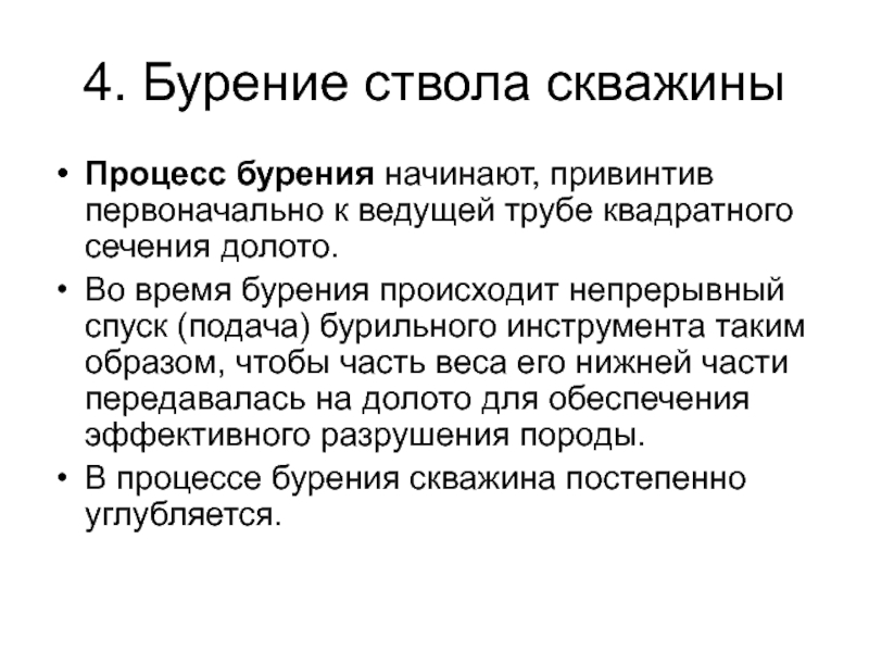Во время бурения происходит непрерывный спуск (подача) бурильного инструмента таким образом, чтобы часть веса его нижней части передавалась на долото для обеспечения эффективного разрушения породы.
