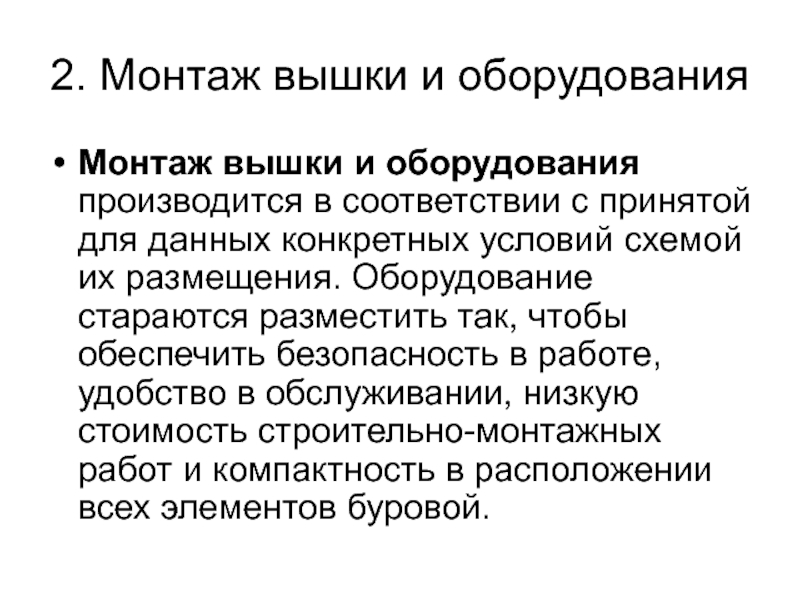 соответствии с принятой для данных конкретных условий схемой их размещения. Оборудование стараются разместить так, чтобы обеспечить безопасность в работе, удобство в обслуживании, низкую стоимость строительно-монтажных работ и компактность в расположении всех элементов буровой.