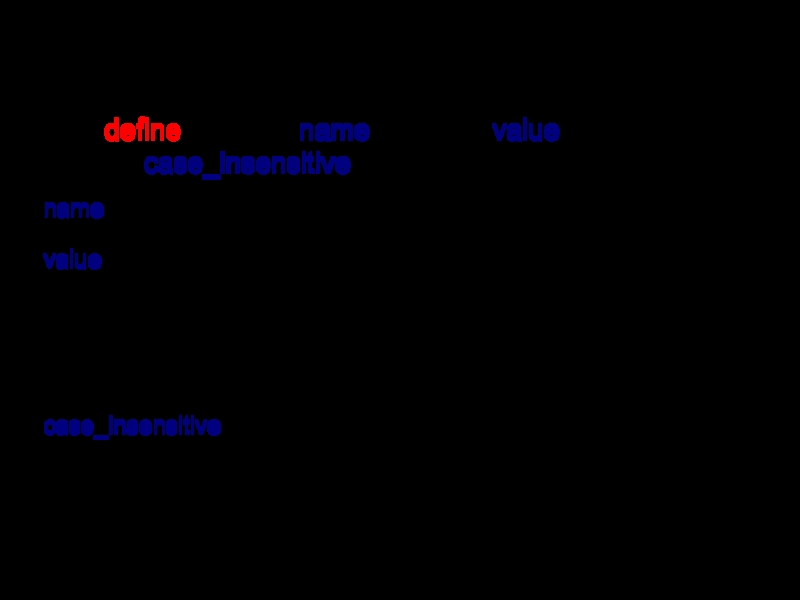 case_insensitive - если параметр установлен как TRUE, то константа будет определена без учета регистра. По умолчанию регистр учитывается, т.е. CONSTANT и Constant могут содержать различные значения.