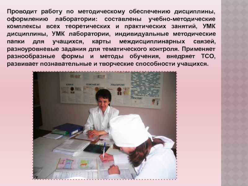 Слайд 11Проводит работу по методическому обеспечению дисциплины, оформлению лаборатории: составлены учебно-методические комплексы