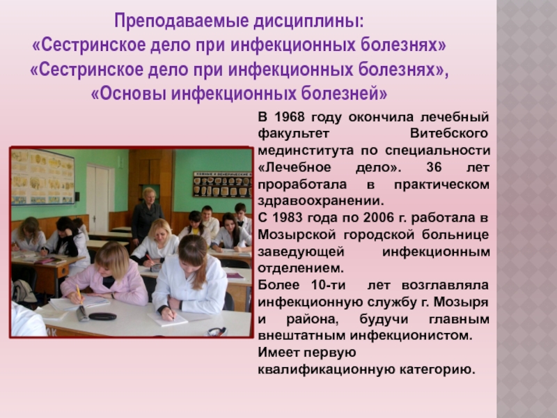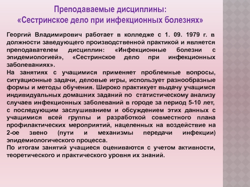 с 1. 09. 1979 г. в должности заведующего производственной практикой и является преподавателем дисциплин: «Инфекционные болезни с эпидемиологией», «Сестринское дело при инфекционных заболеваниях».