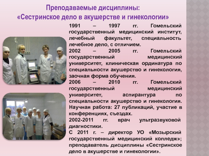C 2011 г. – директор УО «Мозырский государственный медицинский колледж»; преподаватель дисциплины «Сестринское дело в акушерстве и гинекологии».