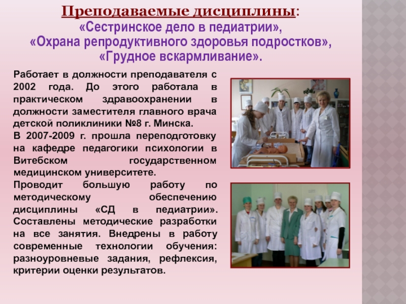 Работает в должности преподавателя с 2002 года. До этого работала в практическом здравоохранении в должности заместителя главного врача детской поликлиники №8 г. Минска.