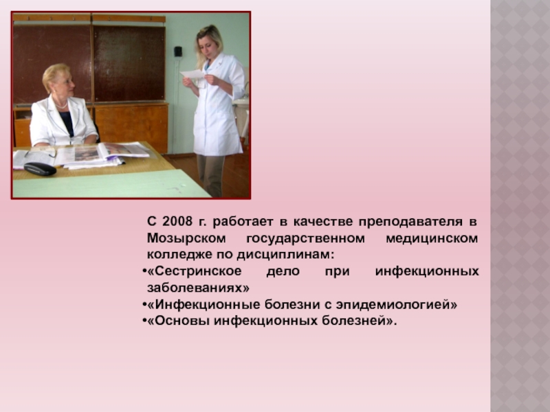 Слайд 18С 2008 г. работает в качестве преподавателя в Мозырском государственном медицинском