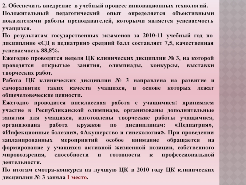 Ежегодно проводится внеклассная работа с учащимися: принимаем участие в Республиканской олимпиаде, организованы дополнительные занятия для учащихся, изготовлены творческие работы учащимися, организована работа кружков по дисциплинам: «Педиатрия», «Инфекционные болезни», «Акушерство и гинекология». При проведении запланированных мероприятий особое внимание обращается на формирование у учащихся активной жизненной позиции, собственного мировоззрения, способности и готовности к профессиональной деятельности.