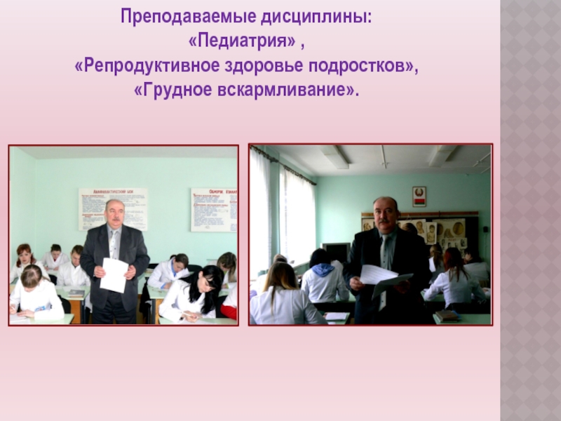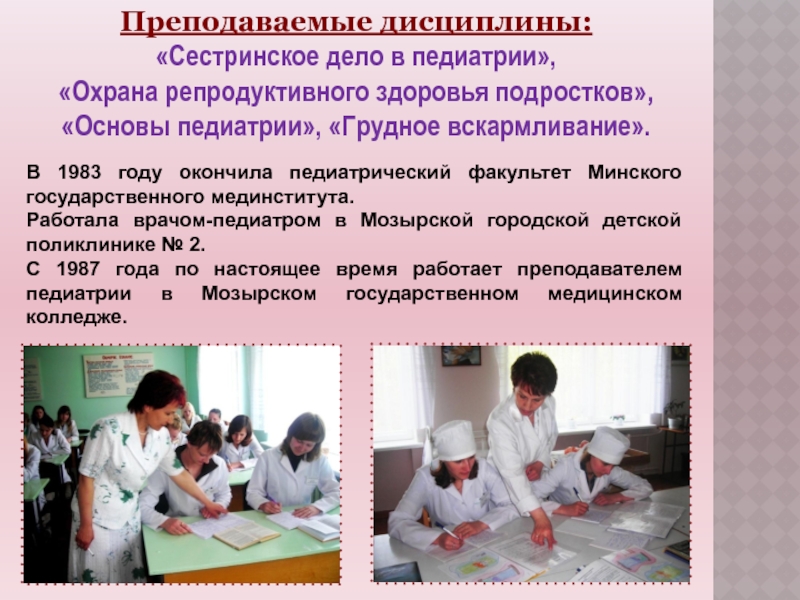 «Сестринское дело в акушерстве и гинекологии», «Акушерство», «Гинекология», «Педиатрия», «Сестринское дело в педиатрии», «Основы педиатрии», «Сестринское дело при инфекционных заболеваниях», «Основы инфекционных болезней», «Инфекционные болезни с эпидемиологией», «Основы репродуктивного здоровья», «Грудное вскармливание».