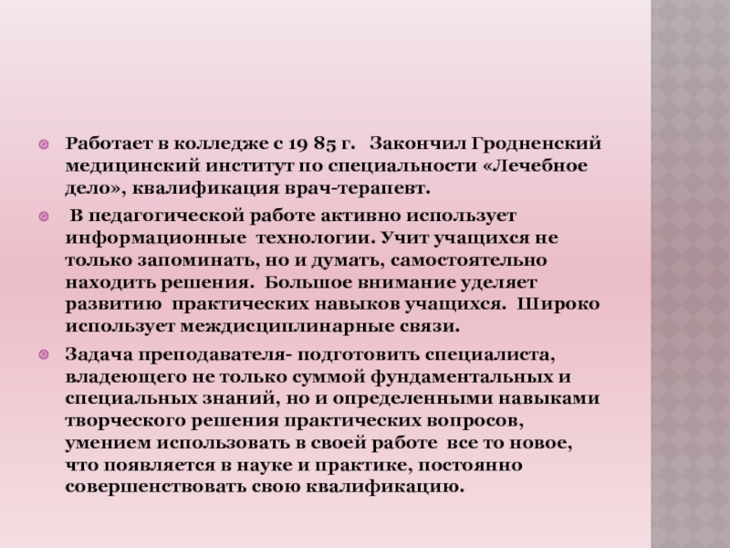 Работает в колледже с 19 85 г. Закончил Гродненский медицинский