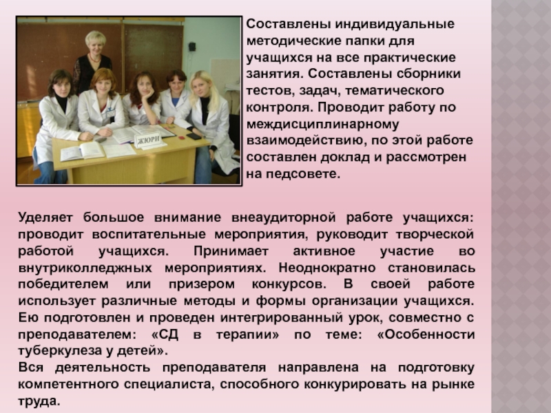 работой учащихся. Принимает активное участие во внутриколледжных мероприятиях. Неоднократно становилась победителем или призером конкурсов. В своей работе использует различные методы и формы организации учащихся. Ею подготовлен и проведен интегрированный урок, совместно с преподавателем: «СД в терапии» по теме: «Особенности туберкулеза у детей».