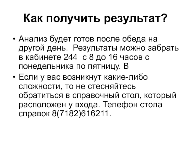 Анализ будет готов после обеда на другой день. Результаты