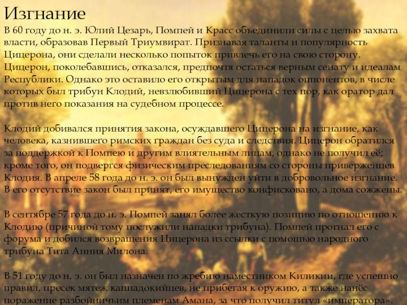 объединили силы с целью захвата власти, образовав Первый Триумвират. Признавая таланты и популярность Цицерона, они сделали несколько попыток привлечь его на свою сторону. Цицерон, поколебавшись, отказался, предпочтя остаться верным сенату и идеалам Республики. Однако это оставило его открытым для нападок оппонентов, в числе которых был трибун Клодий, невзлюбивший Цицерона с тех пор, как оратор дал против него показания на судебном процессе.